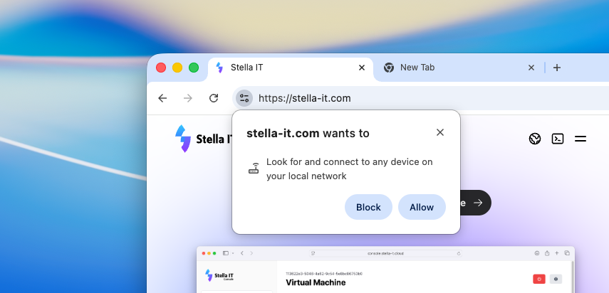 만약, Stella IT에서 결제시 아래와 같이 '로컬 네트워크 액세스 허용/차단' 팝업이 표시된다면 '허용' 또는 'Allow'를 클릭하여 주시기 바랍니다.